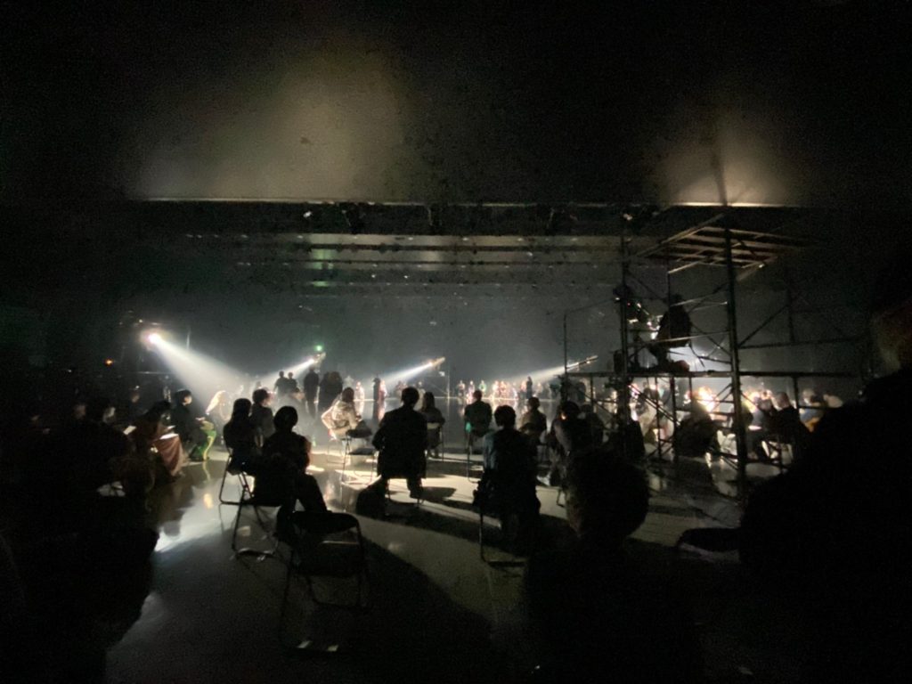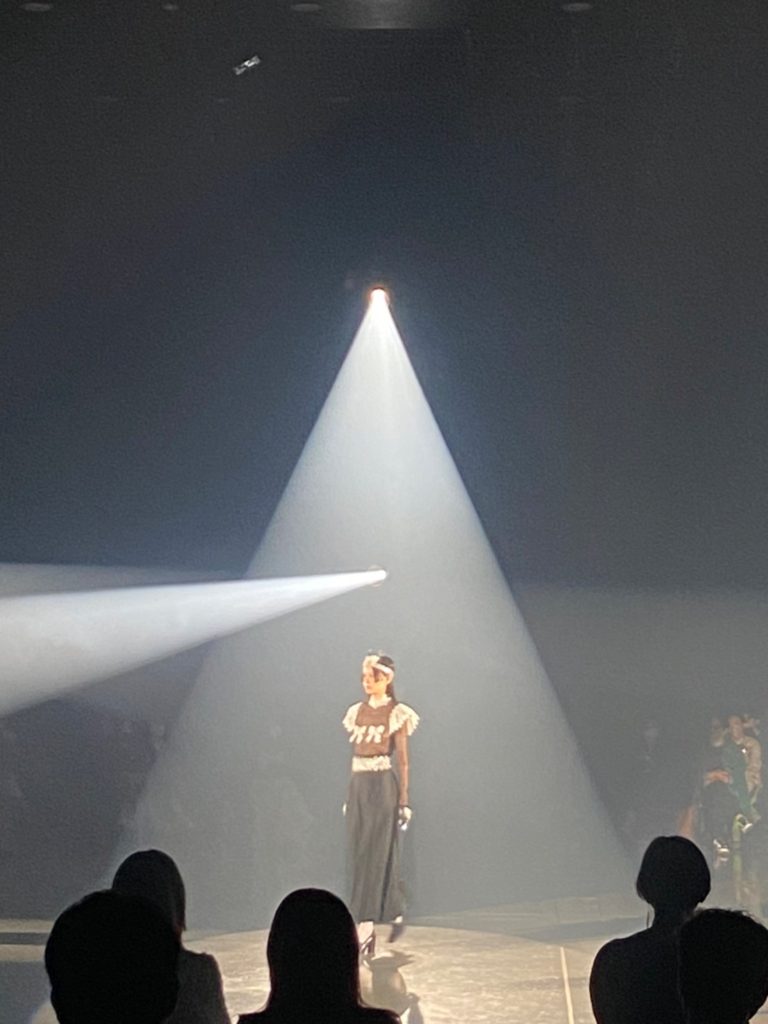 今回のコレクションは前半に大阪文化服装学院のスーパーデザイナー学科の現役学生による「DOKKA VIVID」と「YUUNA ICHIKAWA」のインスタレーションが行われた。私も現役学生であることから、同じ現役学生によるインスタレーションには関心を寄せていた。現役学生による展示からはプロの場への「挑戦」という強いエネルギーが感じられ、観客として見ている私が彼らの作品からポジティブなエネルギーを受け取った。FFiの大学生メンターとして「一流の体験、一流のモノ、一流の人からクリエイティブな刺激を得る」という環境が、現役学生がプロの世界へと挑戦している姿と重なる部分があり、作品から得たエネルギーがより大きかったと感じる。 「DOKKA VIVID」と「YUUNA ICHIKAWA」のインスタレーションの後、観客が一度ホール外へ退出し、その間にホール内では「Tananakadaisuke」のランウェイに向けたセットチェンジが行われていた。「Tananakadaisuke」のランウェイは円形に客席が設置してあり、モデルが円の中を反射しながら歩くような構成であった。今回のようなランウェイの形は一つの作品を何度も見ることができるという利点がある。従来イメージされるランウェイのように一本の舞台上をモデルが一直線に歩くものでは、目の前で作品を見る機会は多くても2回程度であるが、円形のランウェイではモデルが反射しながら歩くことで、作品が近くを何度も通るので気になる物を長時間目で追うことができる。ランウェイという作られた概念に変化をもたらす工夫が見られ、「服を作る」ということだけにとどまらず多様な形での創造性に触れることができた。(Mutsuko/FFiメンター大学2年)